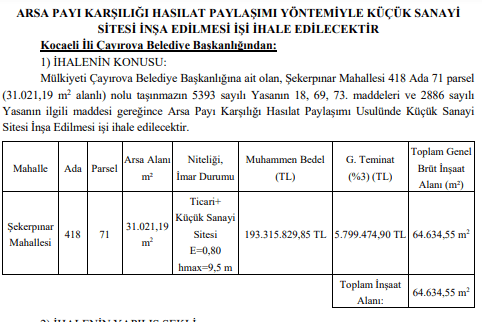 Çayırova Şekerpınar Mahallesi’nde bulunan 418 ada 71 parsel alanda toplamda 31 bin 21,19 metrekare alanın ilanı Resmi Gazete’nin bugünkü sayısında yayınlandı. Toplam genel brüt inşaat alanı 64 bin 634,55 metrekare olarak belirtilen projenin muhammen bedeli 193 milyon 315 bin 819 TL 85 kuruş olarak belirlendi. Ayrıca söz konusu işin süresinin 550 gün olduğu da yayınlanan ilanda yer aldı.